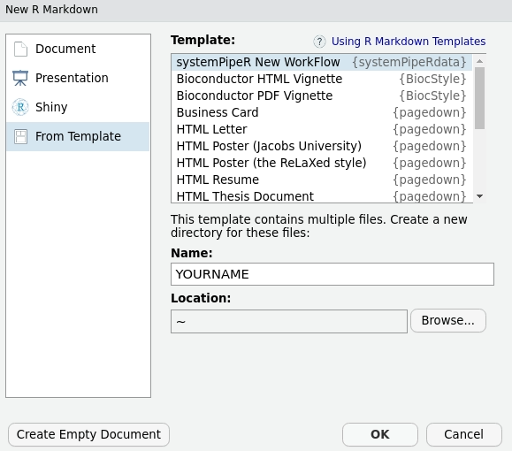 menu File -> New File -> R Markdown -> From Template -> systemPipeR New WorkFlow.